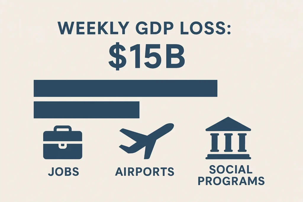 - Golpe semanal estimado: hasta US$15,000 millones menos de PIB por cada semana de cierre, de acuerdo con un memo económico de la Casa Blanca.