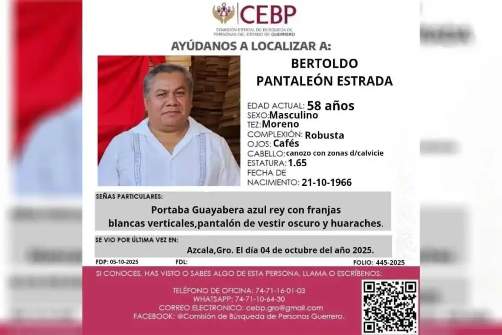 La tarde del 6 de octubre, autoridades de Guerrero confirmaron el hallazgo del cuerpo del padre Bertoldo Pantaleón Estrada, párroco de San Cristóbal en Mezcala, municipio de Eduardo Neri. El sacerdote de 58 años había sido reportado como desaparecido desde el sábado 4, cuando se le vio por última vez en la región Centro del estado. La Fiscalía General del Estado (FGE) abrió una carpeta por homicidio calificado y peritos procesaron la escena en el tramo entre Zumpango y Mezcala, sobre la carretera federal México–Acapulco.